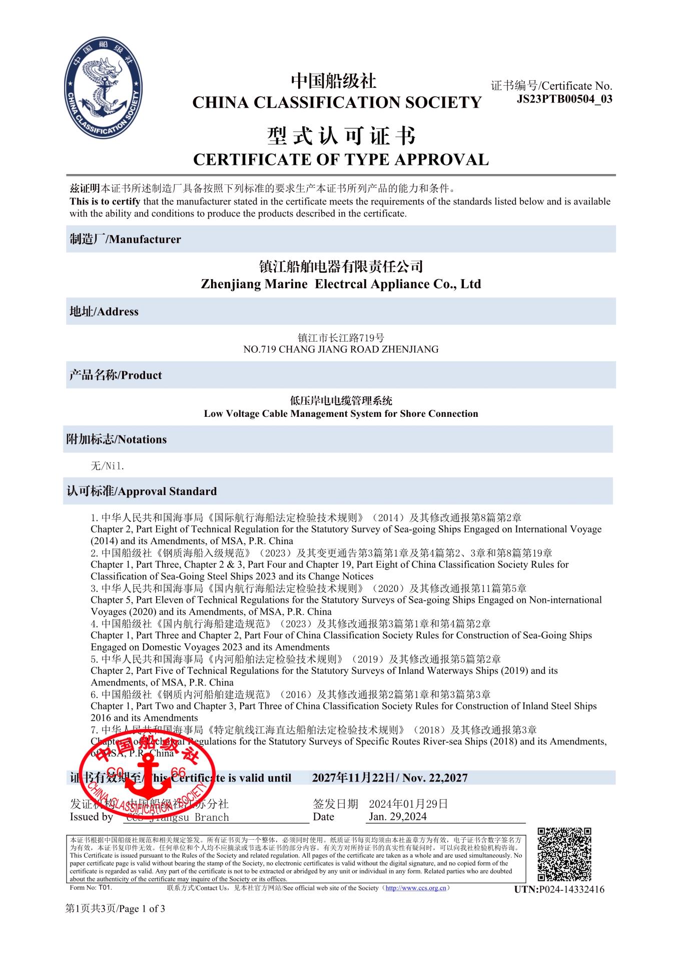 低压岸电电缆管理系统型式认可证书