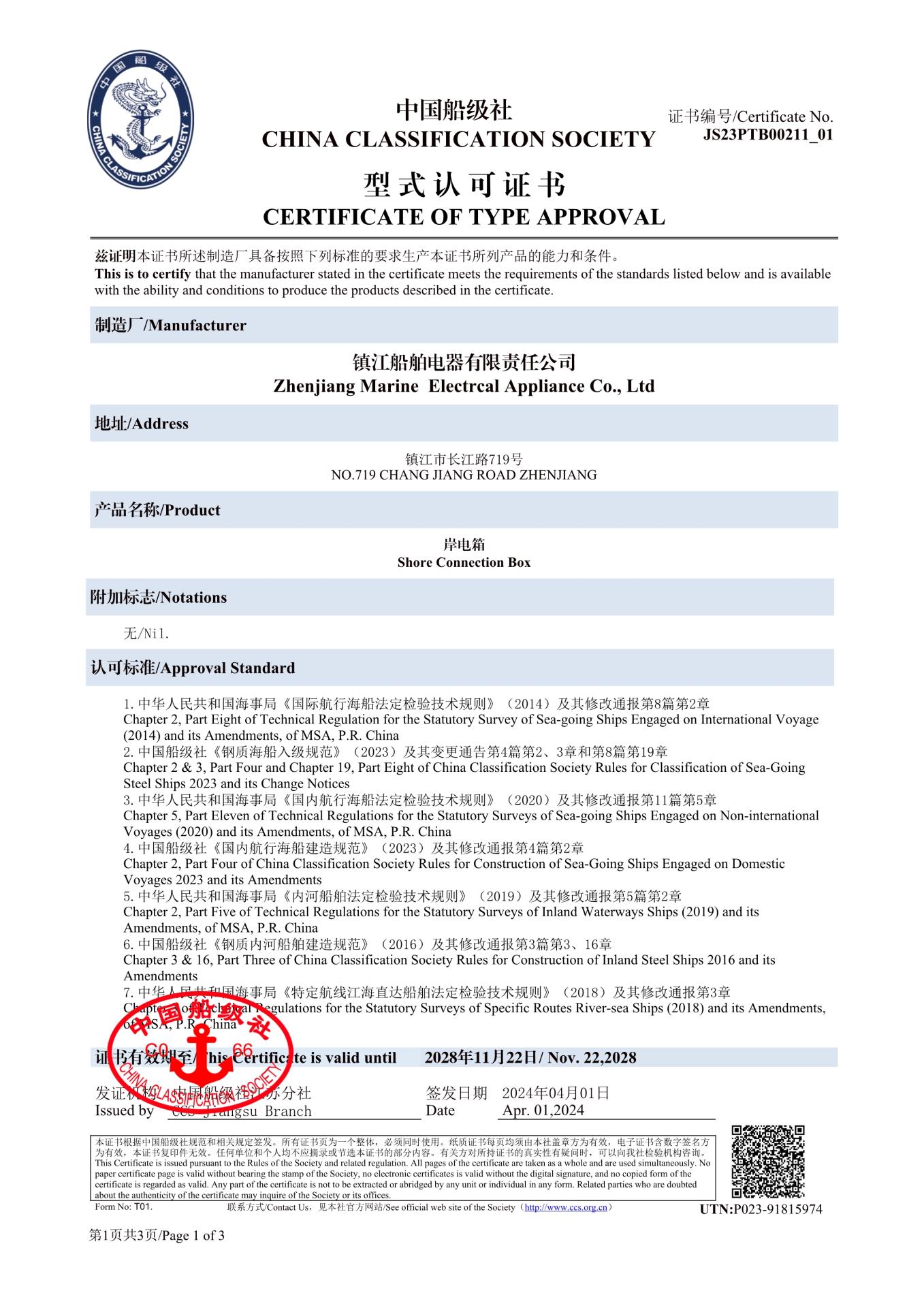 岸电箱型式认可证书