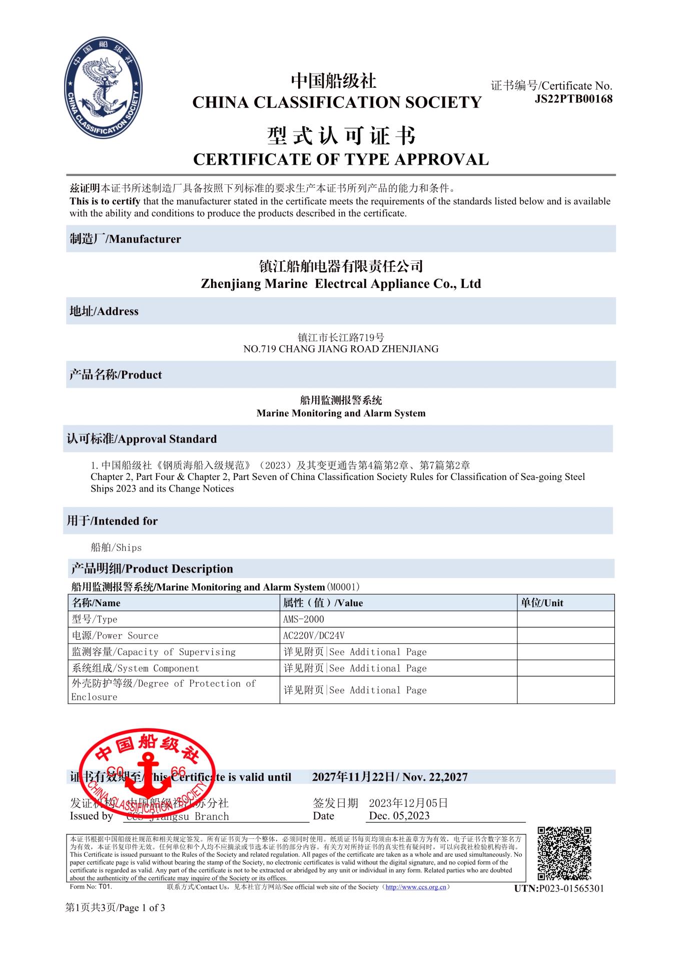 船用监测报警系统型式认可证书